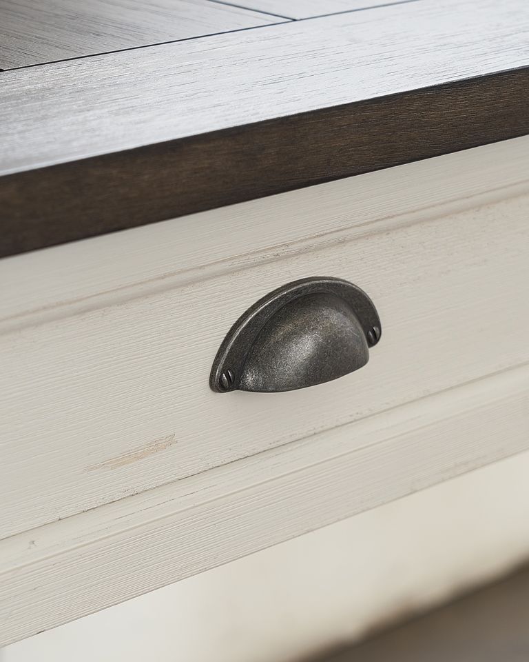 Steve Silver Company harmoniously blends elements of contemporary and cottage styling to create a modern farmhouse look with the Cayla occasional collection. The tables feature a two-tone finish of antiqued white base with dark oak top and each table features a drawer with cup drawer pull that gives the collection a vintage look white offering valuable storage.