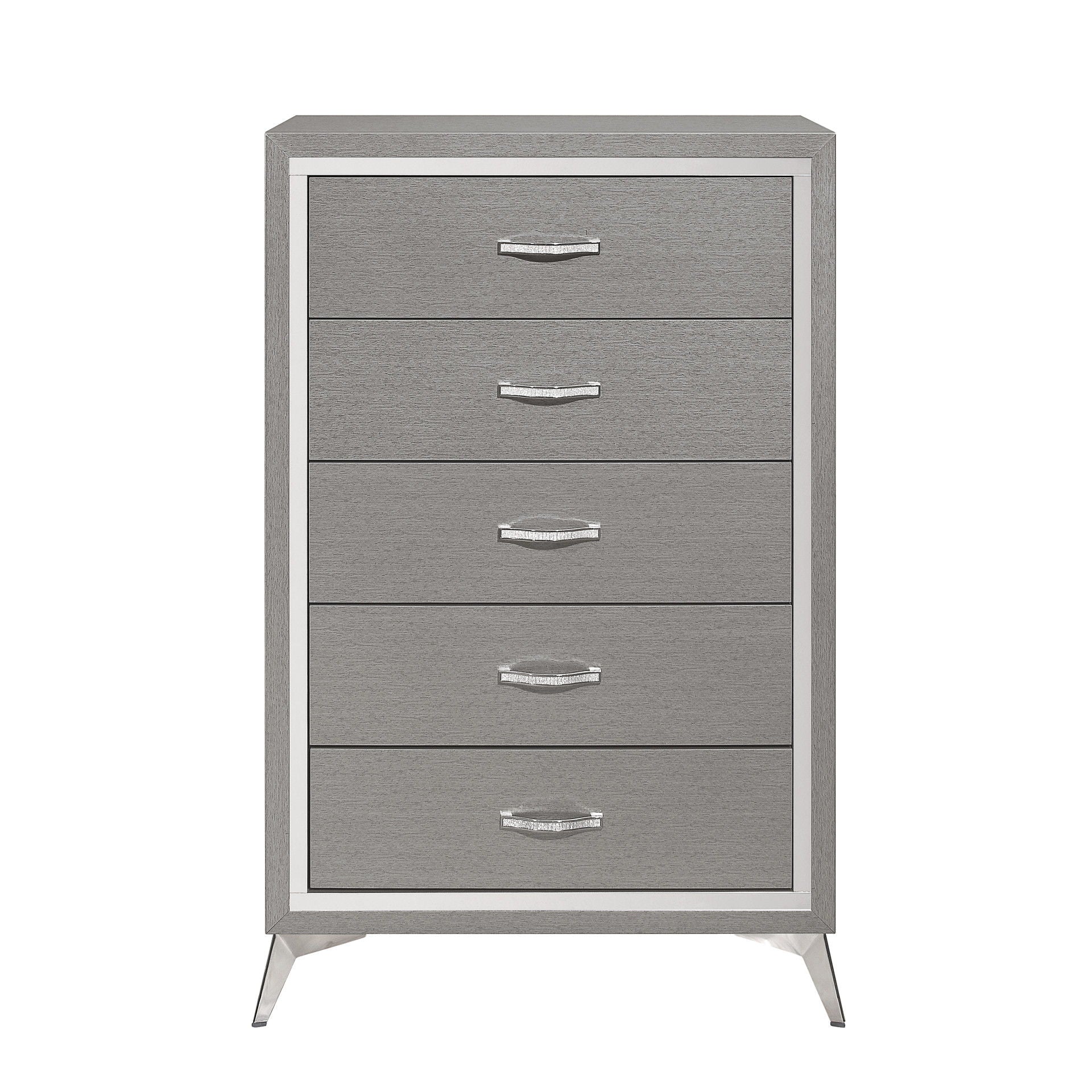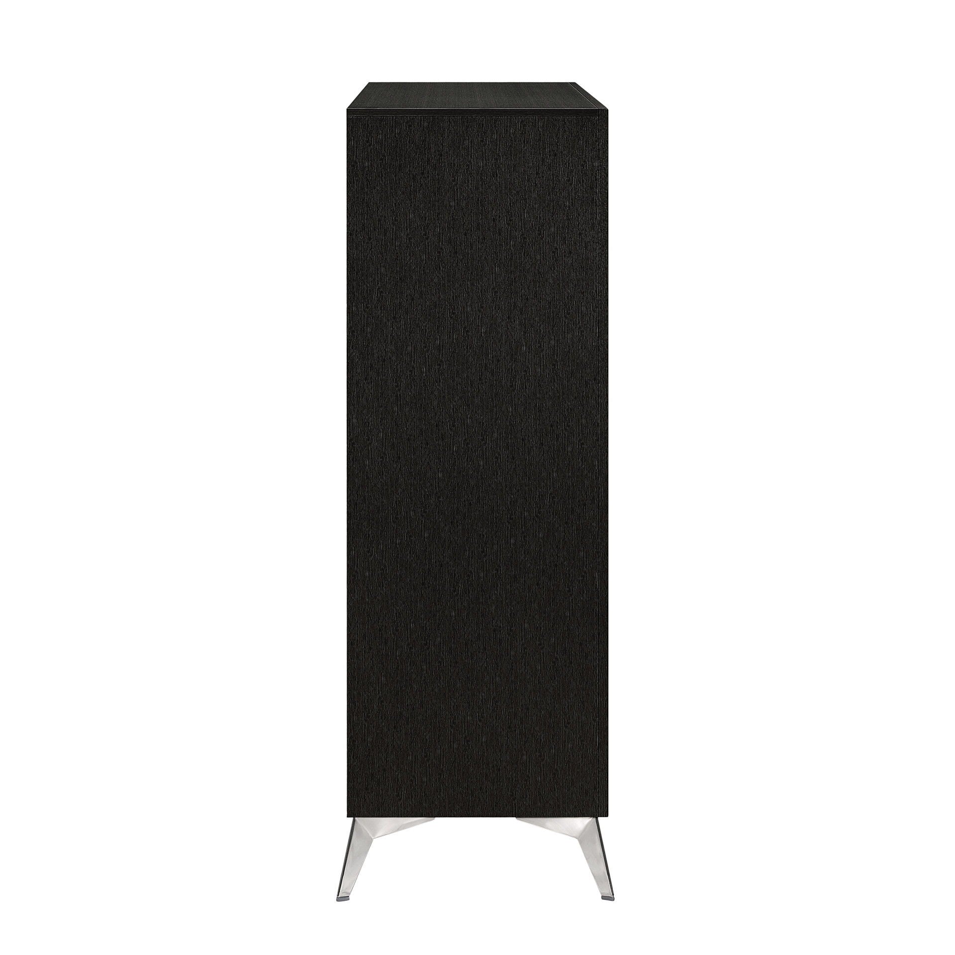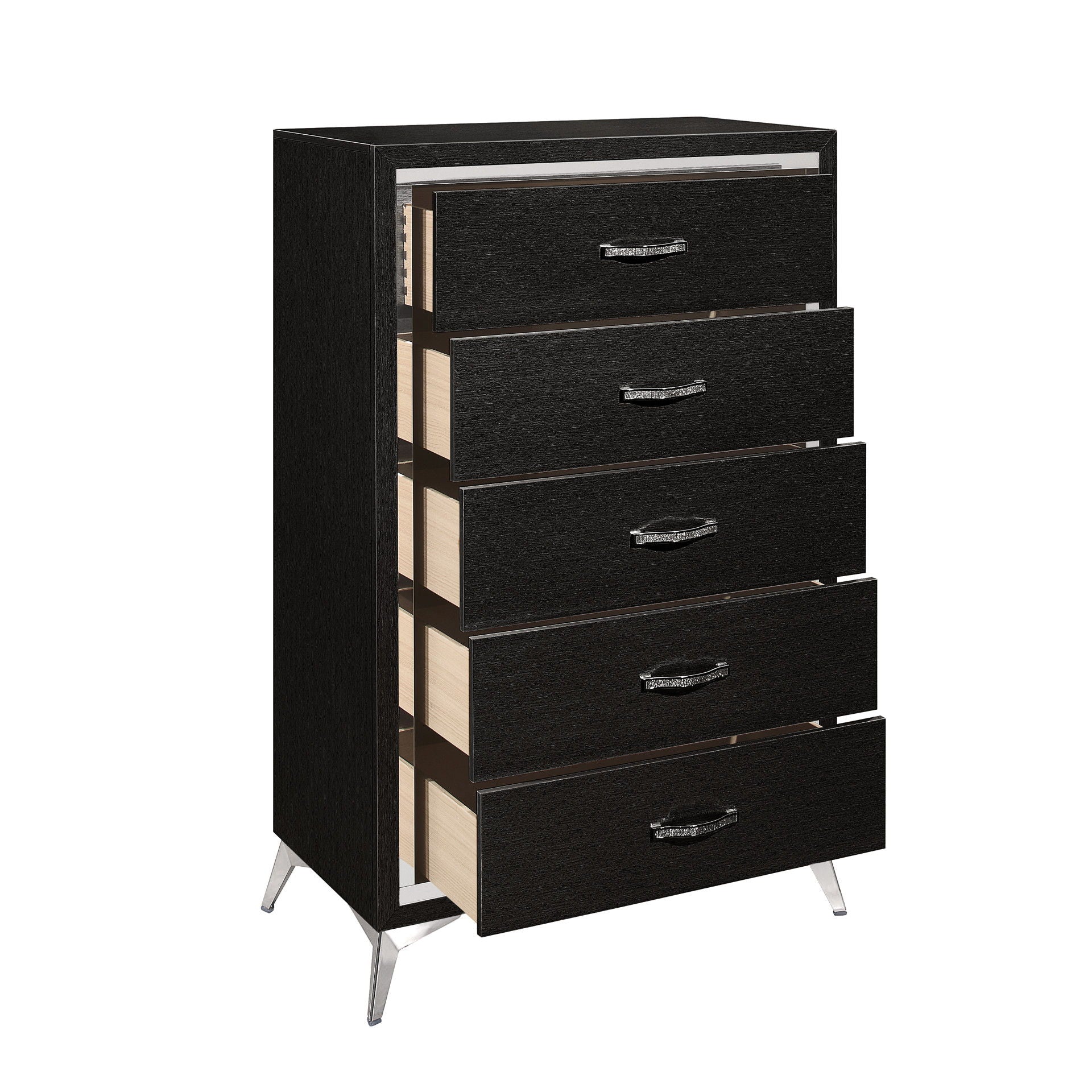 The Huxley 5-Drawer Chest combines contemporary glam with durable construction for a stylish addition to your bedroom. This vertical dresser is crafted from manufactured woods and eco-friendly decorative laminate, ensuring it will stand the test of time. The design features clean lines with metallic accents and flared silver legs, adding a modern touch. Its rich finish provides a sleek, sophisticated look that is both timeless and modern, highlighting the metallic accents and smooth surfaces for a chic and polished aesthetic. The quality drawer construction includes English dovetail joinery and smooth-rolling center glides for long-lasting operation. Functional and fashionable, this chest offers ample storage for clothing, with chic, crystal-studded drawer pulls for easy access.