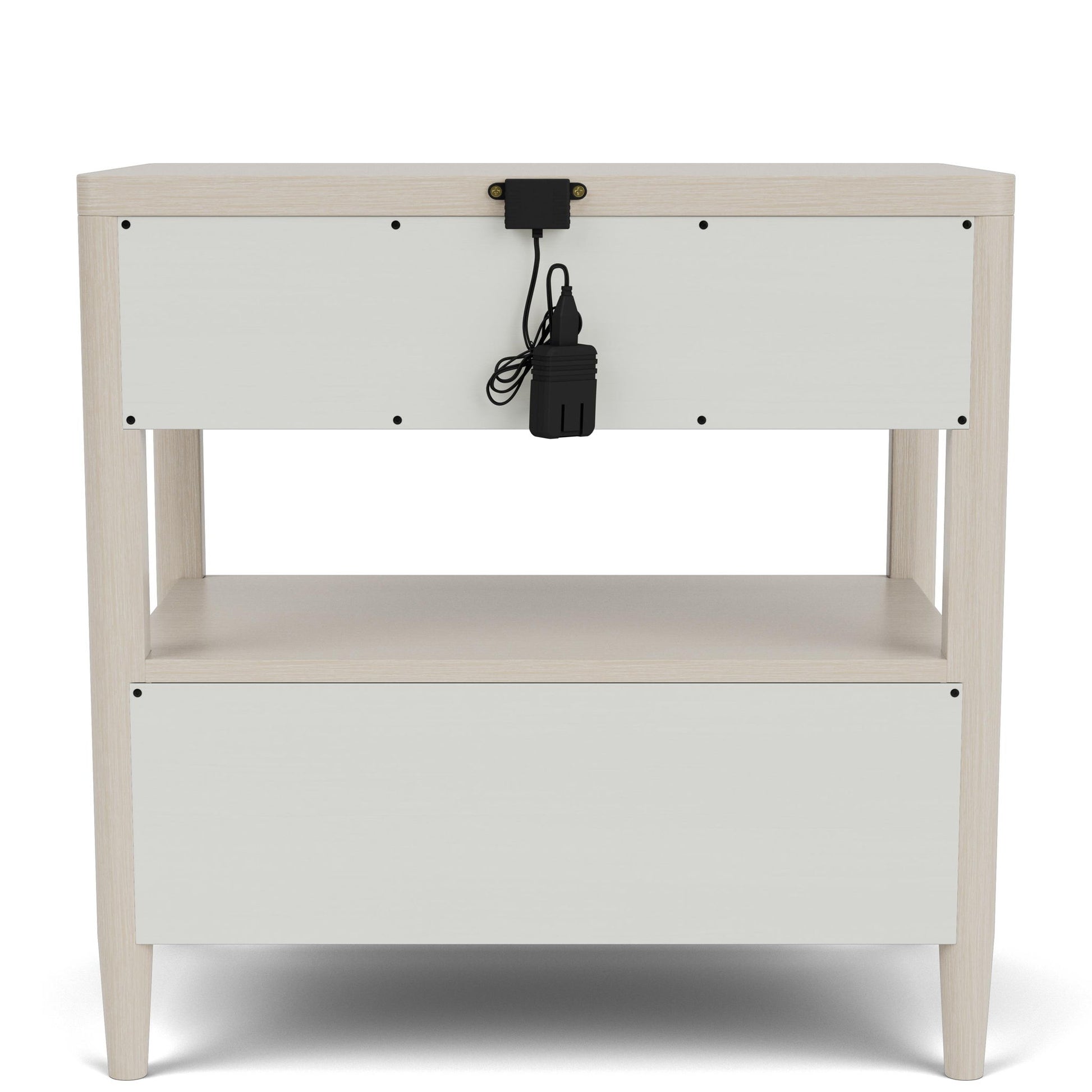 - Open shelf between drawers for display or storage