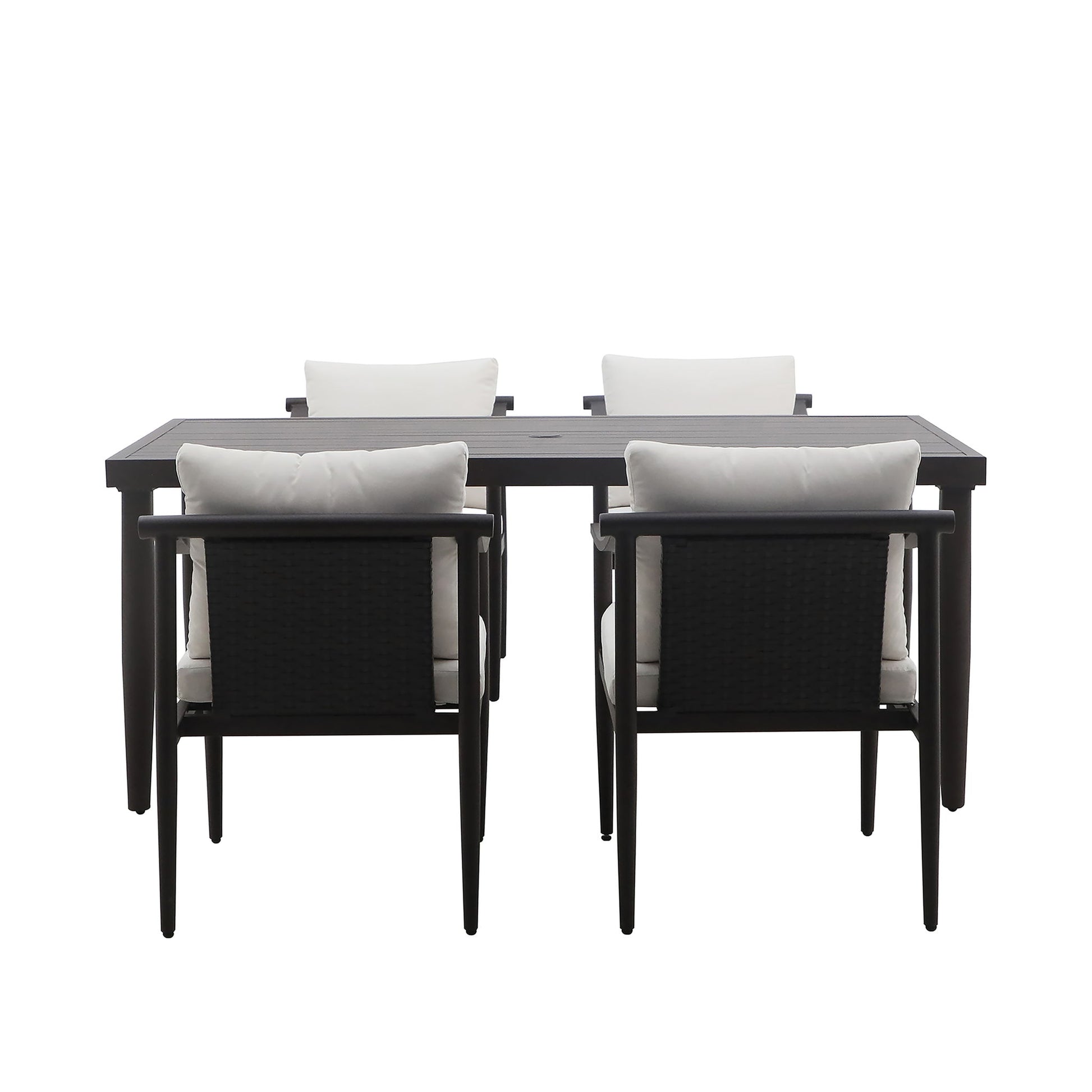 Experience outdoor dining in style with the Moana Outdoor Patio Dining Set, featuring a durable table and side chairs with comfortable blue cushions. The aluminum frames boast a baked-on powder coat finish, providing a strong foundation that resists scratches and enhances longevity. The table''s classic slatted top not only adds aesthetic appeal but also aids in water drainage, making it practical for any weather. Crafted from high-density PE wicker, the set offers the timeless look of wicker with the modern benefits of being low-maintenance, colorfast, and resistant to water, mildew, and fading. The chairs come with cushions made from our exclusive Sundura™ fabric, a solution-dyed 100% polyester that resists fading, mildew, and moisture, ensuring vibrant color season after season. High-density 6cm foam cushions provide comfortable seating, and with a generous 72-inch length, the table accommodates up to eight people, perfect for family dinners or outdoor gatherings. The minimalist design with clean lines and a sleek dark frame allows this dining set to seamlessly blend into various outdoor settings, offering a stylish and understated look for contemporary spaces.