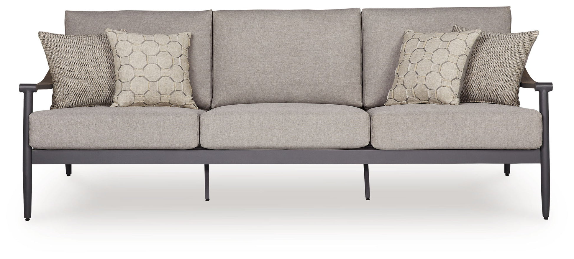 A refined marriage of style and durability, this outdoor sofa adds contemporary flair to your porch or patio. Wood tones and shades of gray lend a versatile, neutral appeal. And this sofa is built to last, thanks to its rust-resistant frame and cleanable, UV-resistant fabric.
