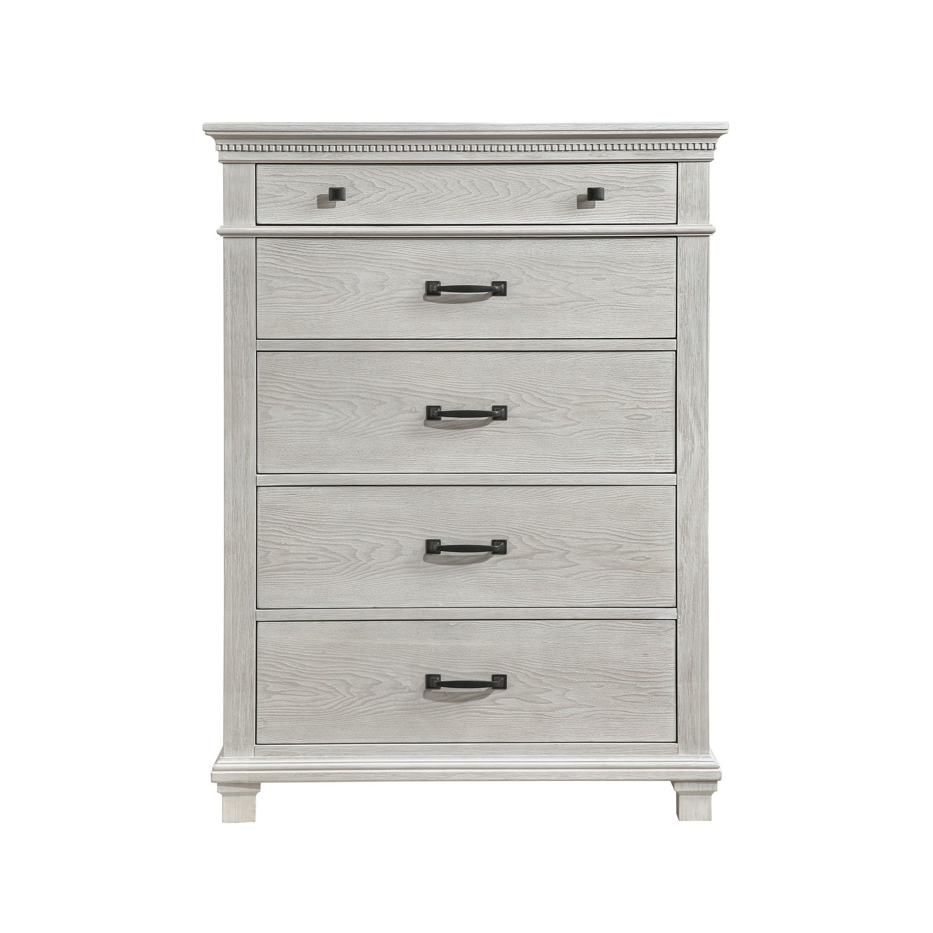 The Silver Sands Chest is built with durable, quality construction using solid pine, manufactured woods, and oak wood veneers, ensuring a strong and stable piece. Its transitional style blends clean, simple lines with a rustic wood finish, creating a calm and inviting atmosphere. The misty gray finish, applied through a meticulous multi-step process, offers a light, weathered look that highlights the natural grain and mineral patterns of the wood. Elegant design features, including a raised base, full return and dentil moldings, and contrasting hardware, add a sophisticated touch. Heirloom-quality drawers with dovetail joinery and three-stage steel ball glides ensure smooth, full-extension operation and can support heavy loads. With five spacious drawers, including a velvet-lined top drawer to protect delicates, this chest provides ample storage for clothing essentials. Combining style, durability, and functionality, this chest is a practical and elegant addition to any bedroom.