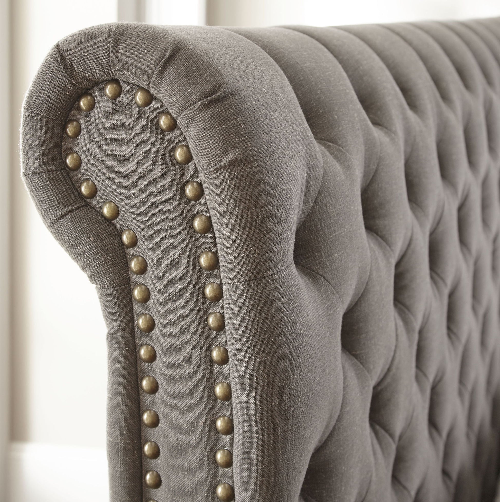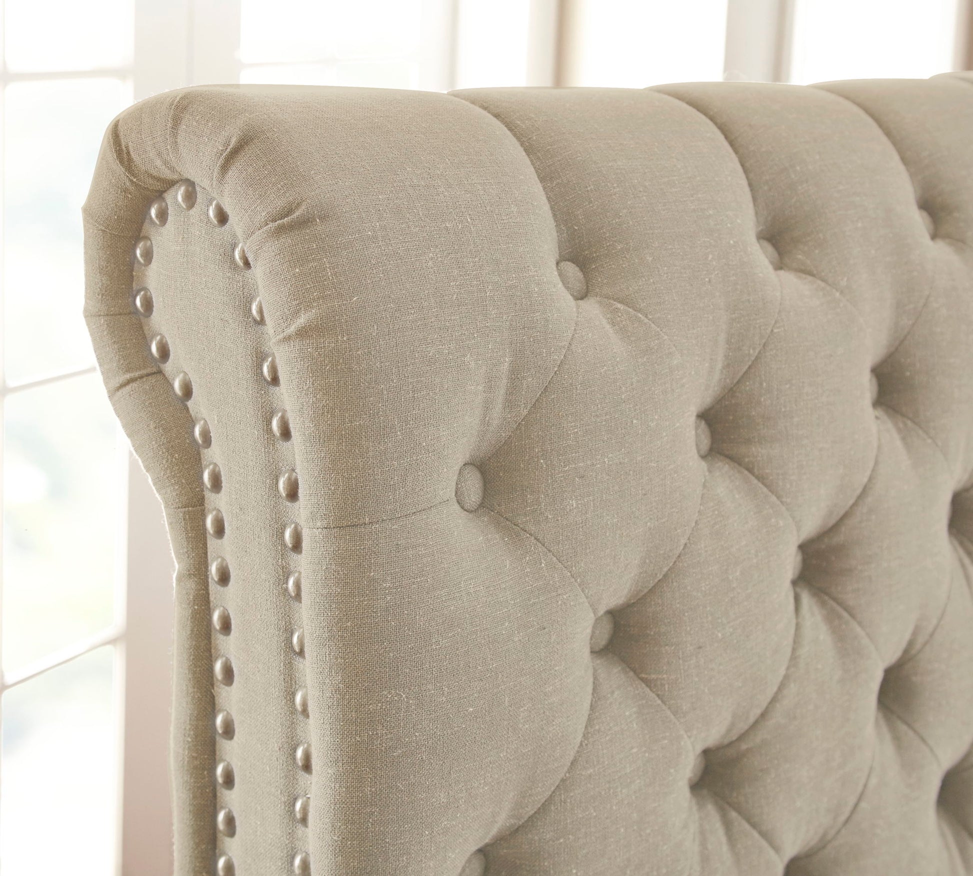 Relax in comfort with the elegant Swanson Upholstered Bed featuring a tufted headboard with nail head accents. Style is well stated in the rolled headboard and footboard and comfort is ensured with the comprehensive foundation featuring a 39 piece slat system with center supports to accomodate a box spring and mattress, or for the lower profile of a platform bed, can use a mattress only.