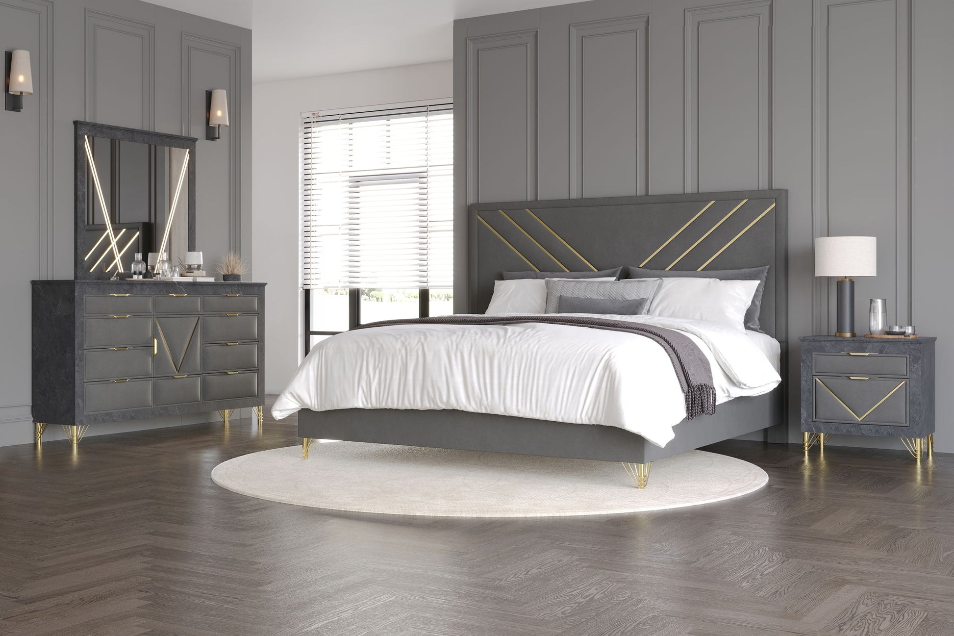 Transform your space with the Symmetry Bedroom Set. Crafted from premium woods with a gray marble laminate, this set radiates timeless elegance. Gold metal and mylar accents add a glamorous touch, while English dovetail drawers ensure durability. The sleek mirror, encased in a marbled frame, features dual accent lighting for brilliance. Designed for luxury, storage, and sophistication in every detail.
