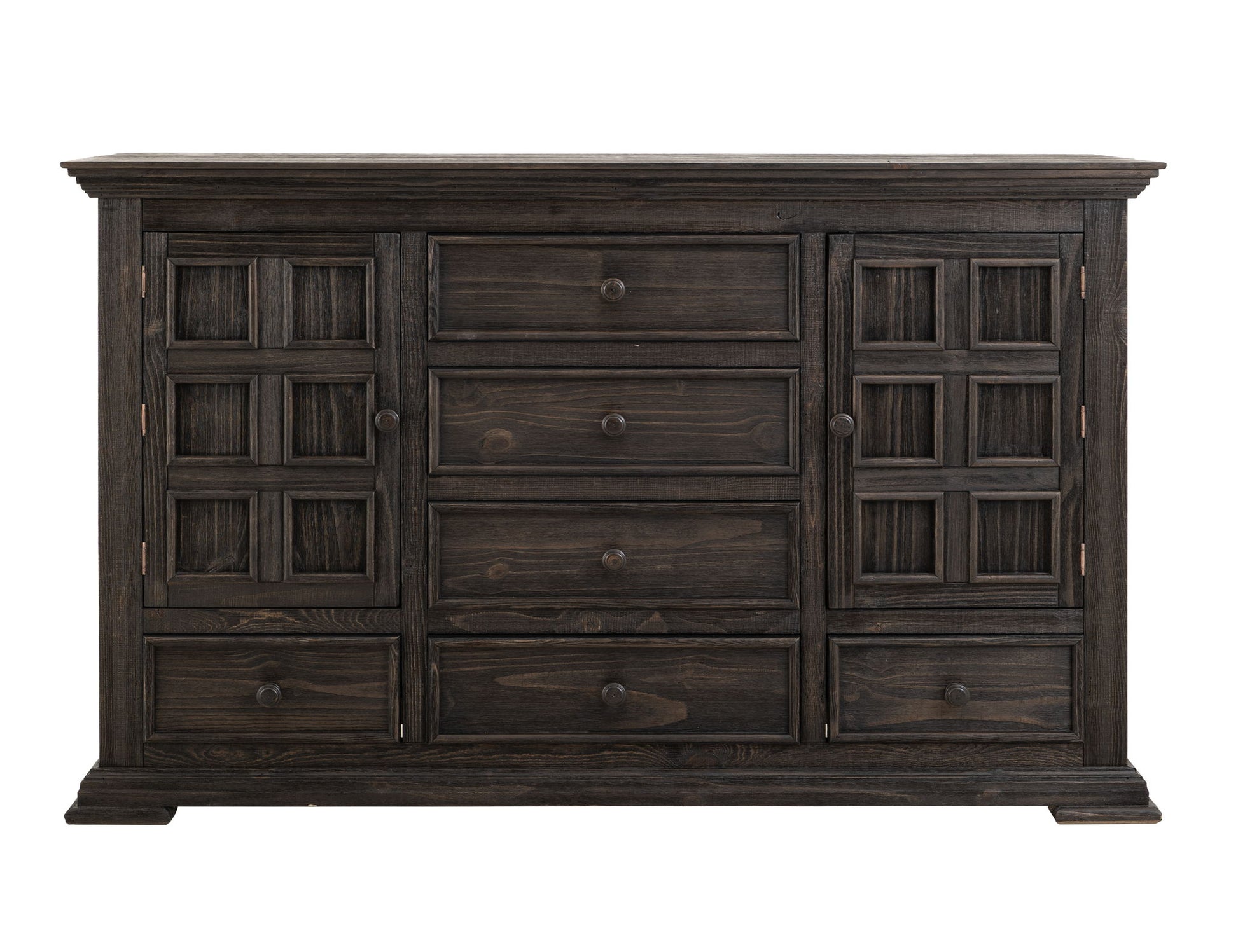 6 Drawer 2 Doors Dresser. Drawing inspiration from transitional design, the Terra collection embodies the effortless elegance of its clean, sturdy shapes and the charming rustic grain of solid pine wood. With a tasteful deep finish, this collection represents a harmonious fusion of modern and traditional elements, making it a timeless addition to your home.