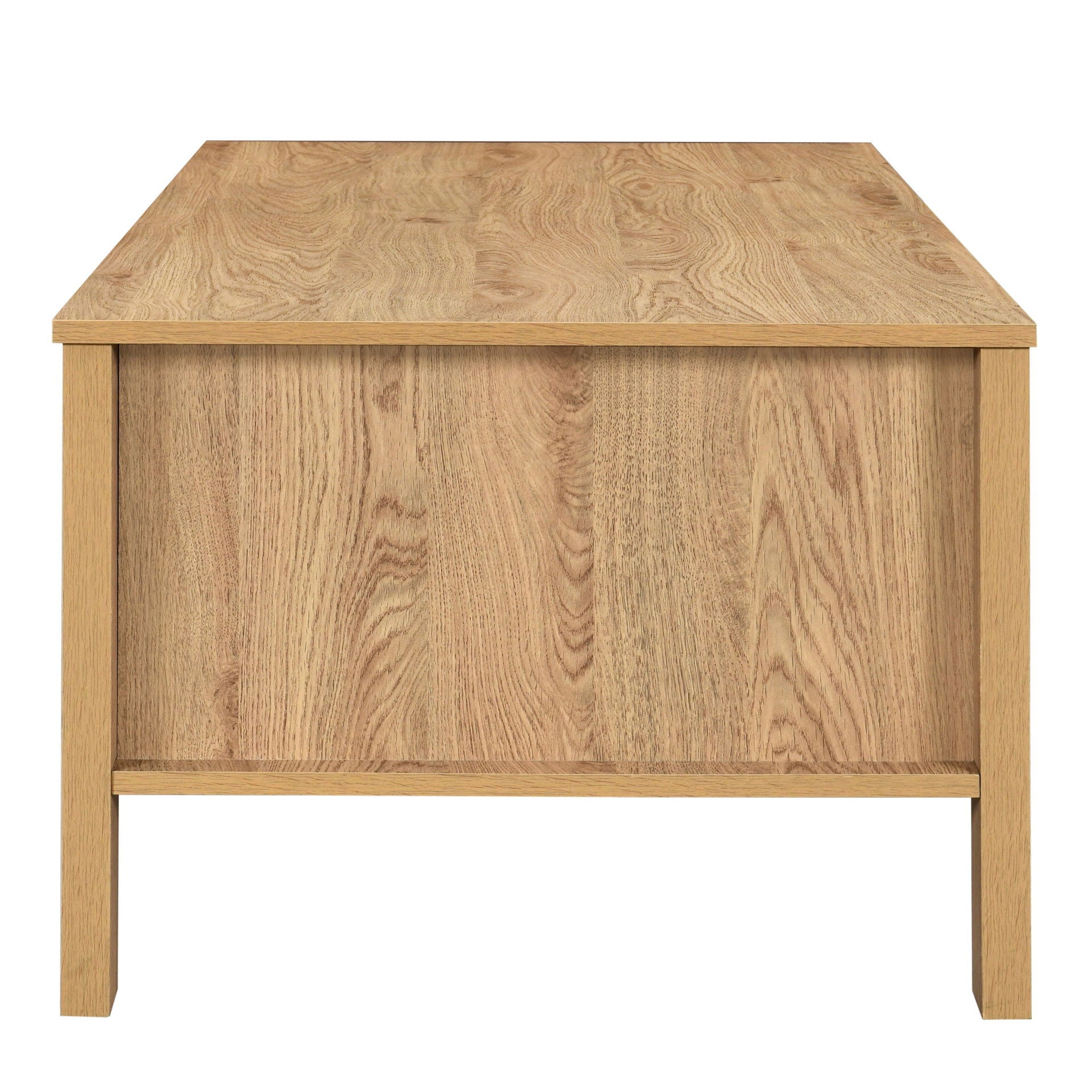 The Thayer 47" Coffee Table blends modern organic style with smart storage. Made from eco-friendly wood with a durable natural oak finish, it features clean lines, vertical reeded detailing, and rich woodgrain texture. Two roomy drawers are hidden behind sleek fronts, perfect for storing remotes, books, and more. A warm, functional centerpiece that adds rustic charm and contemporary appeal to any living space.